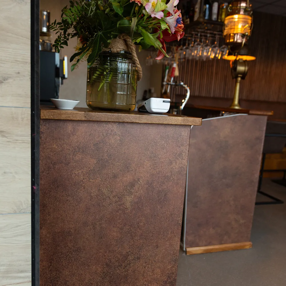 Voor de toonbanken hebben we gekozen voor Patina Moon, een donkergrijze interieurfolie met een prachtig metallic effect. Deze keuze gaf de toonbanken niet alleen een eigentijdse uitstraling, maar zorgde ook voor een stijlvolle en professionele presentatie van de producten.