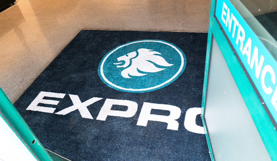 Customize deurmat: Zelfs bij de entree hebben we de huisstijl van Expro laten terugkomen door een op maat gemaakte deurmat te creëren, waardoor klanten en medewerkers direct bij binnenkomst worden verwelkomd met het merk van Expro.