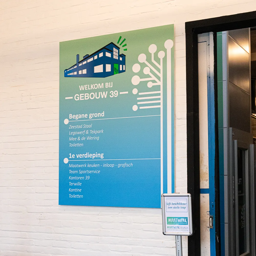Voor Gebouw 39 hebben we een compleet systeem voor bewegwijzering ontworpen en gerealiseerd, volledig in lijn met hun nieuwe huisstijl. Het doel: bezoekers snel en moeiteloos de juiste weg laten vinden, zonder in te leveren op uitstraling.