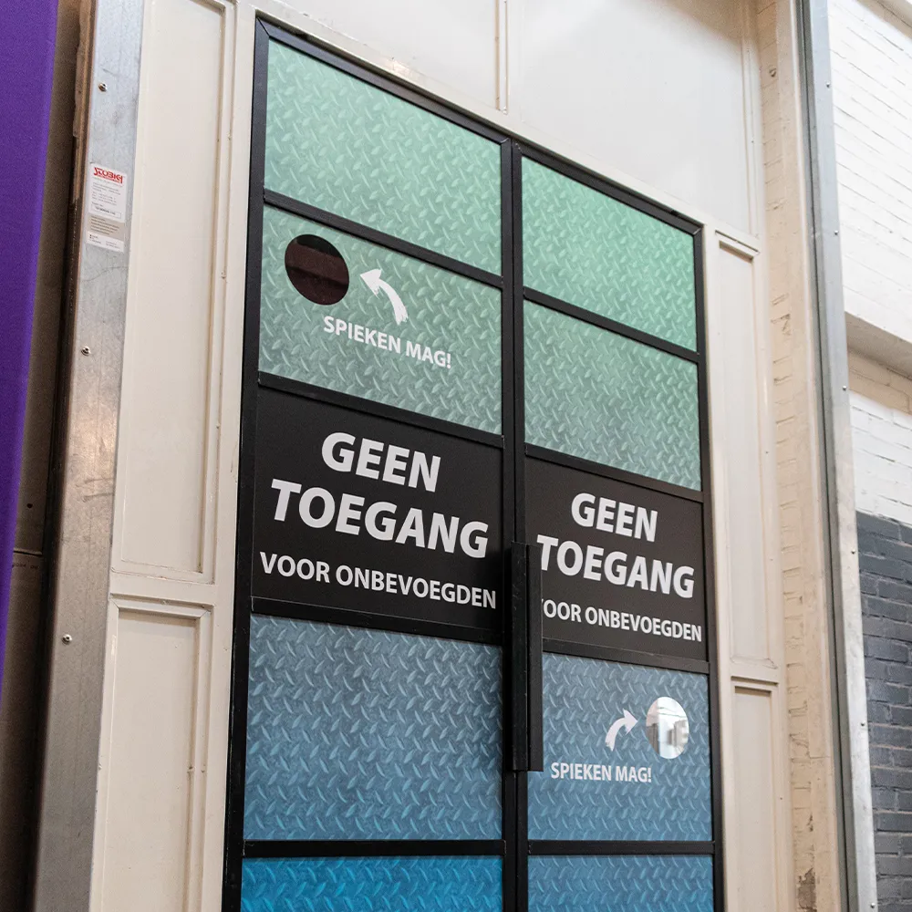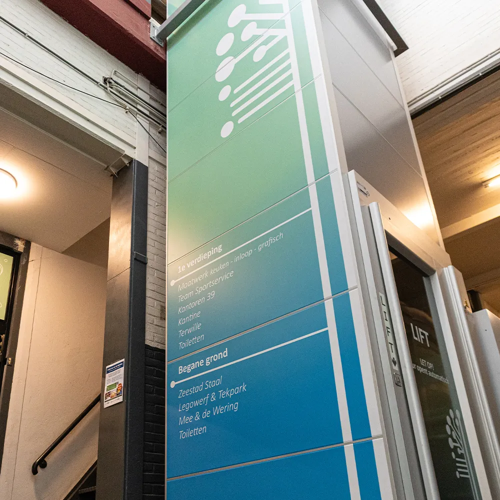 Door het hele pand hebben we gewerkt met verschillende materialen en toepassingen die samen één geheel vormen. Denk aan haakse borden die vanuit meerdere richtingen goed zichtbaar zijn, acrylaat signing voor een strakke en moderne look, en liftstickers die zorgen voor duidelijke en snelle oriëntatie.