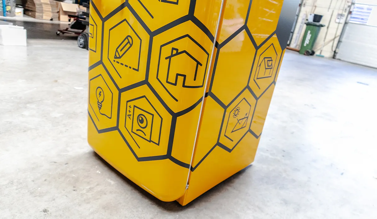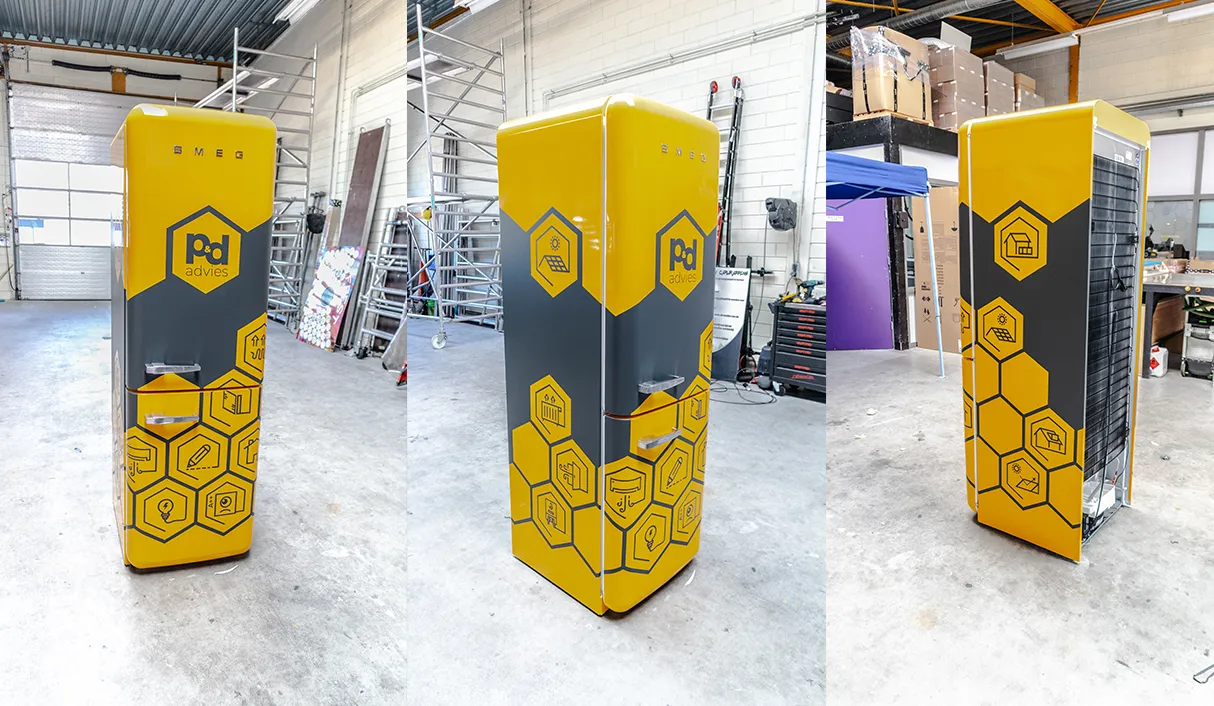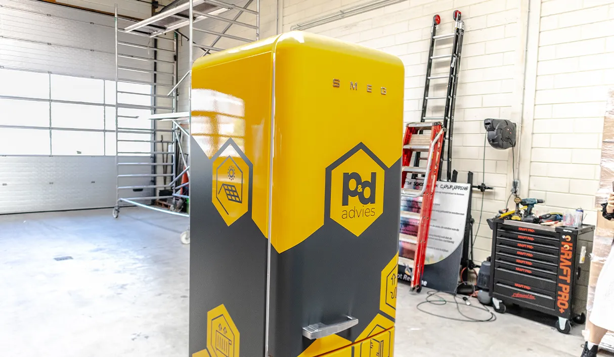 Wrapping is niet alleen een uitstekende manier om uw merk te promoten, maar het biedt ook bescherming aan de onderliggende oppervlakken. Het is een kosteneffectieve oplossing die gemakkelijk aan te passen of te verwijderen is, waardoor je altijd up-to-date blijft met je stijl. Voor P&D Advies hebben we gekozen voor een design dat hun professionele uitstraling benadrukt, terwijl de SMEG koelkast een echte blikvanger in hun kantoorruimte is geworden.